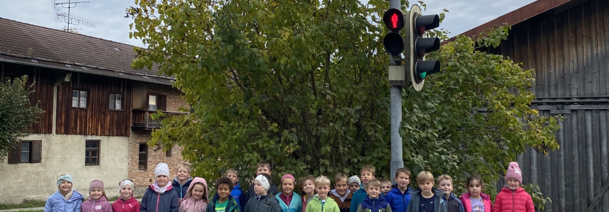 Rot heißt Stehen – Grün heißt Gehen“  – an der Auer Ampel übte die Klasse 1b das richtige und sichere Überqueren der Straße.