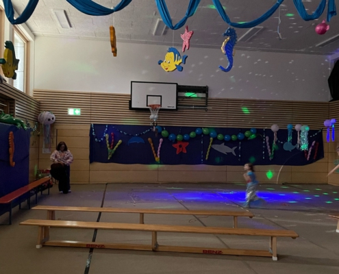 Unter dem Motto „Unterwasser“ wurde die Turnhalle zu einem großen Aquarium umdekoriert. Bei zahlreichen Spielen und gutem Essen war die Gaudi groß. Der Höhepunkt war jedoch der Auftritt der Neubeurer Kindergarde.